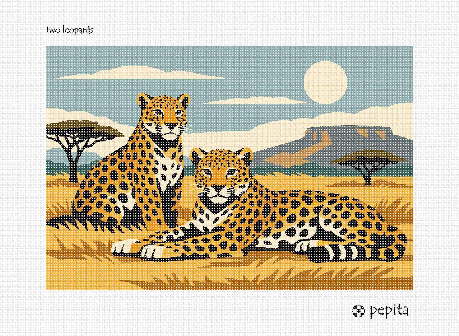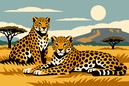 Two majestic leopards rest in a serene savannah landscape, capturing the essence of wildlife with their poised elegance. The palette features warm golds and deep blacks, contrasted against a subtle backdrop of soft blue skies and rich earth tones, creating a tranquil, yet vibrant scene. A harmonious composition of sweeping plains and distant mountains enhances the artwork's depth and allure.