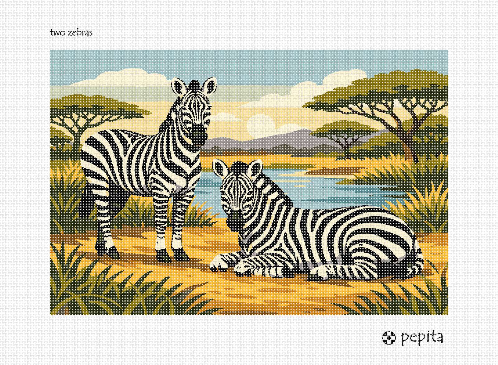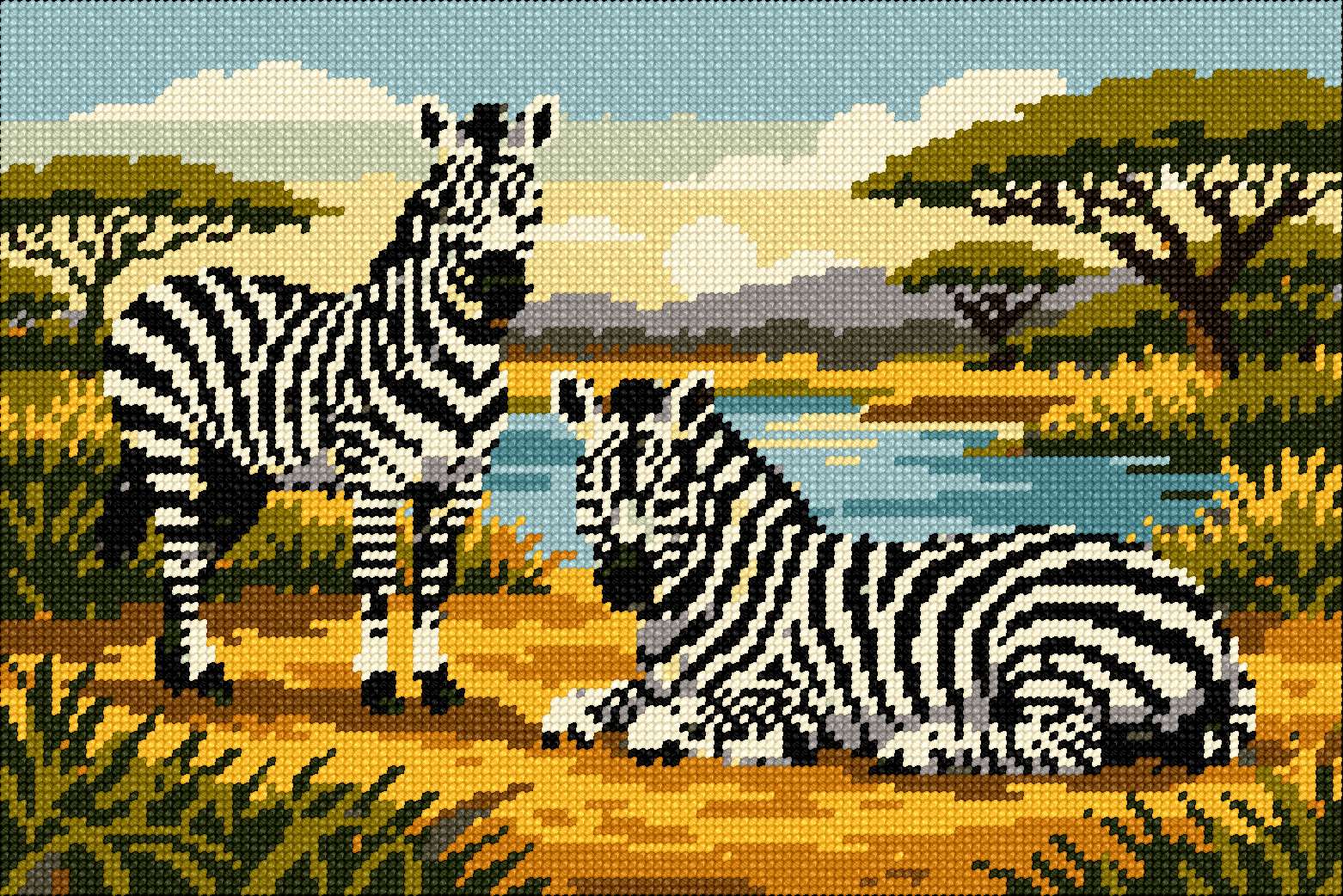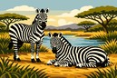 Two zebras grace a serene savannah landscape, captured in striking detail against a tranquil river backdrop. The illustration features a harmonious blend of soft earthy tones and vivid black-and-white contrasts, evoking a sense of calm and natural beauty. Bold lines and balanced composition add a timeless elegance to this wildlife scene.