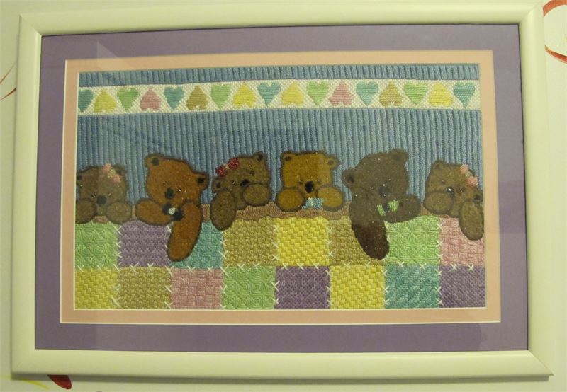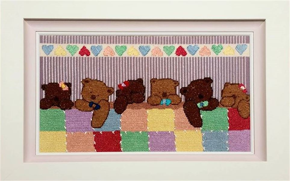 A row of cuddly bears all tucked in.