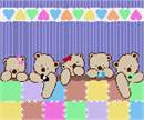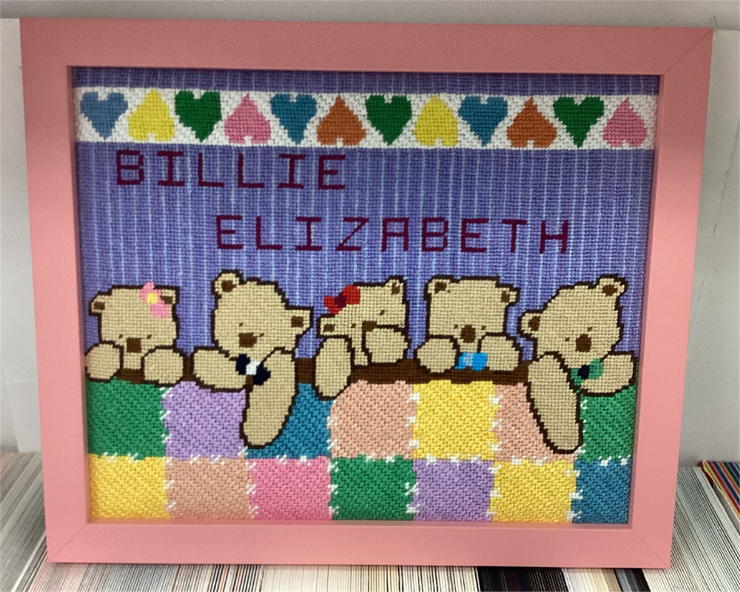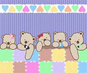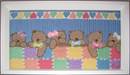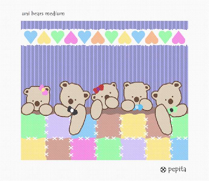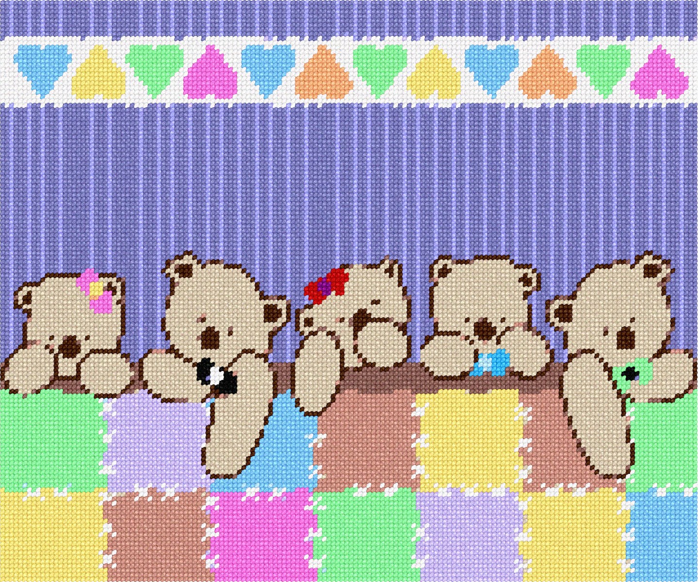 A row of teddy bears all tucked in. This unisex pattern is ideal for baby rooms, shower gifts, and nurseries. Now available in a medium size