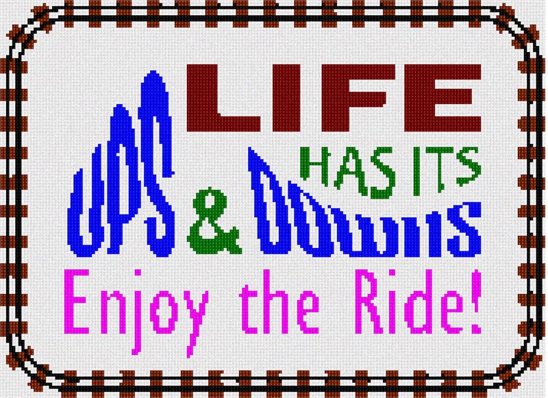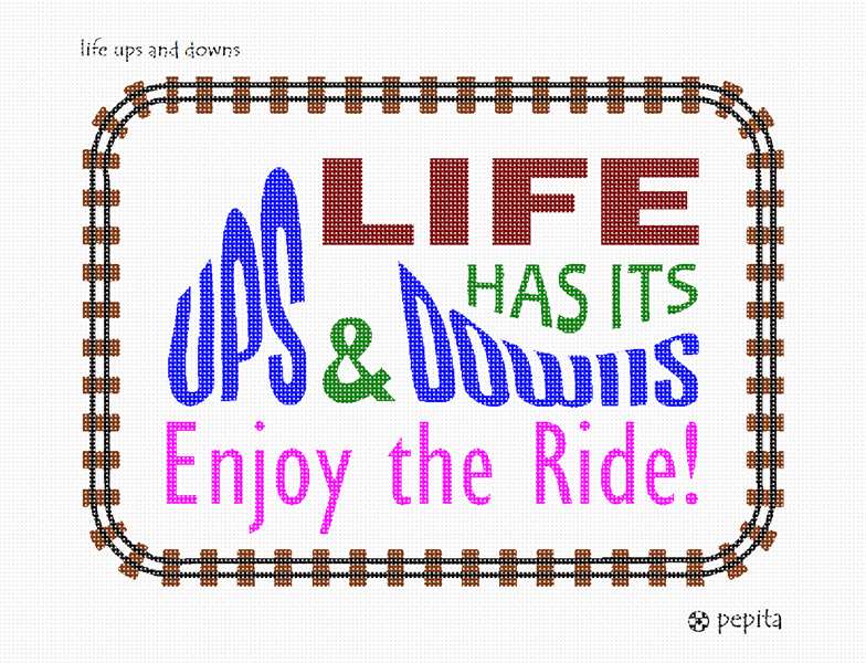Life has its ups and downs. Enjoy the Ride! In alternating colors, the words "Ups and Downs" are shaped like a roller coaster. A train-track frame completes the design.