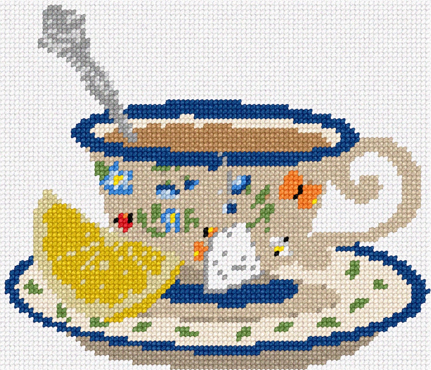Vintage porcelain teacup with painted bumblebees, butterflies, ladybugs, and blue flowers. All this canvas is missing is a sugar cube to suck on while the hot tea melts it on your tongue. Teacups and teapots are popular needlepoint items - especially vintage ones like this. See coordinating teacup design.