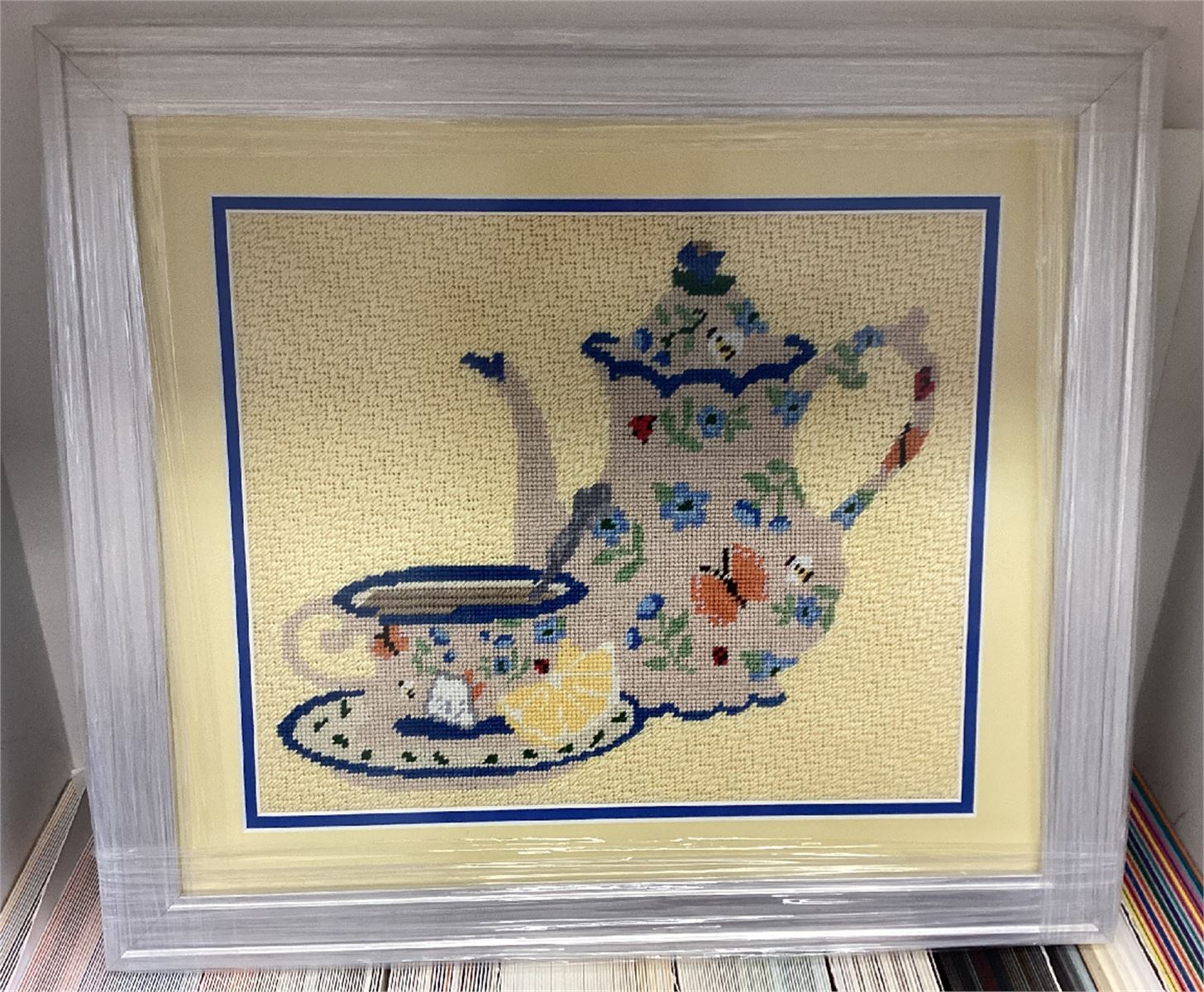 Vintage porcelain teapot and teacup with painted bumblebees, butterflies, ladybugs, and blue flowers. Teacups and teapots are popular needlepoint items - especially vintage ones like this. See coordinating designs.