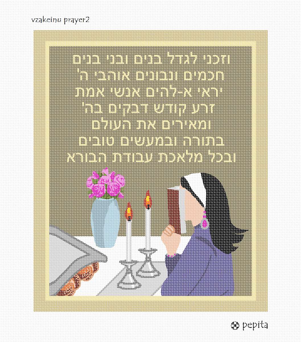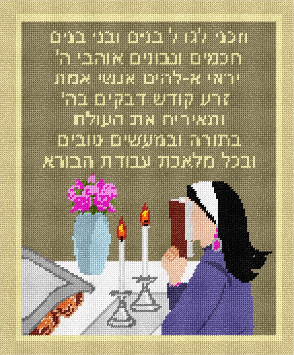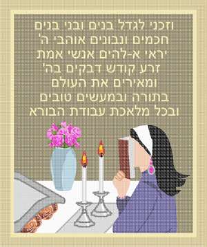 A woman praying after lighting candles at the Shabbos table. Every Friday evening eighteen minutes prior to sunset, Jewish women throughout the world light candles to usher in the Shabbos. This is part of their heritage and a mitzvah that has guided them throughout the generations. Like their mothers and grandmothers before them, they know the Sabbath is a preciosu gift. It's a special and sacred time for the Jewish woman to pray for anything, and her prayers are heard by the One Above. The Vzakeinu Prayer specifically intends for merit to raise righteous children who recognize, love, and fear G-d, that are truthful, honest, and smart. Their children should light up the world with their good deeds and Torah virtues. These women are privileged to have this opportunity every week. In fact, many songs have been composed with these holy Hebrew lyrics.