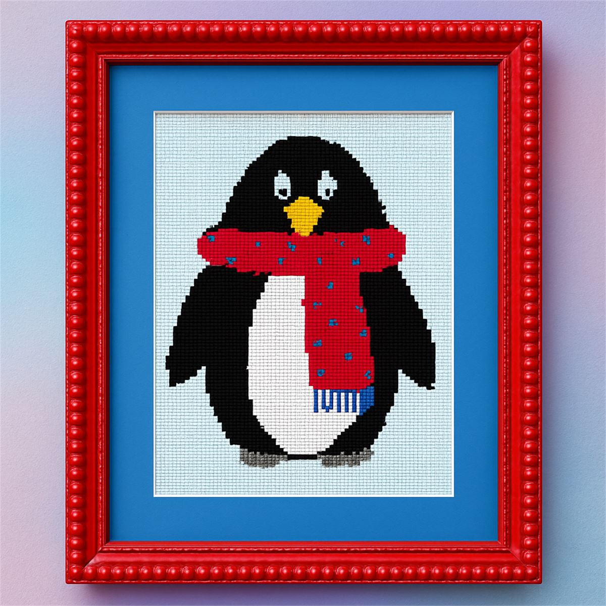 A penguin dressed up for the freezing cold in a red scarf.
