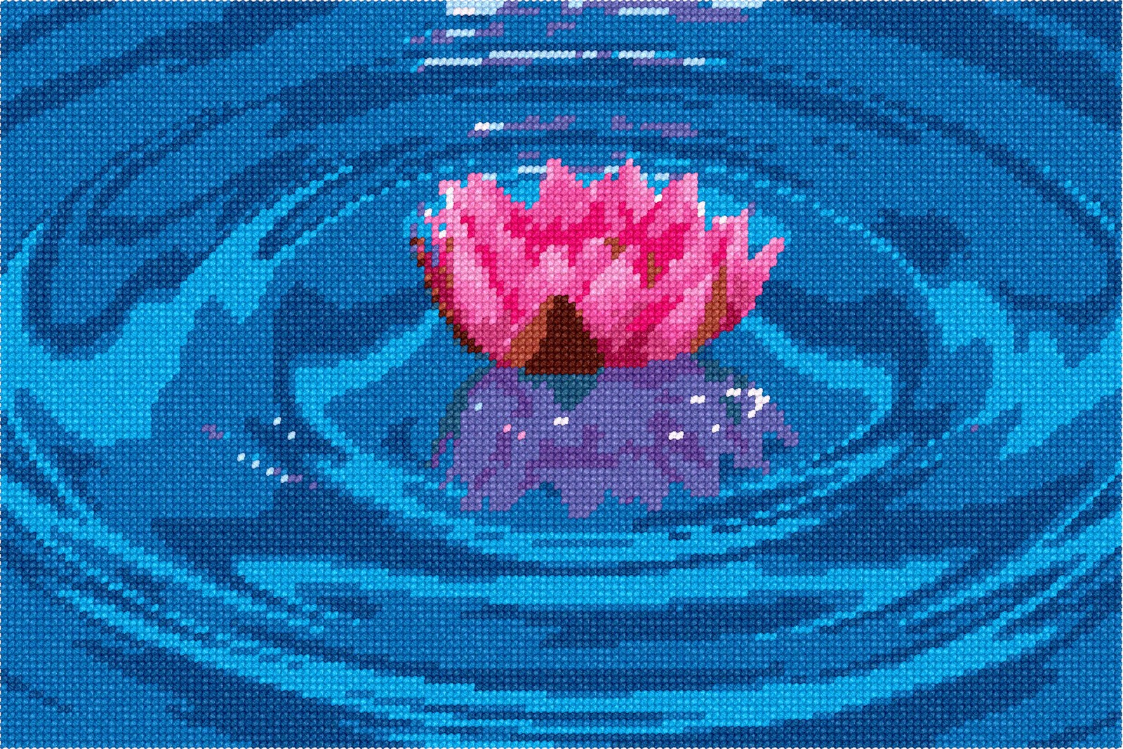 Bright overexposure on this fantastic water lily. Lily pads are part of a larger pond plant that thrives in shallow lakes and ponds. There are about 70 different species of this aquatic flowering plant, found in both temperate and tropical zones. Because they are such beautiful plants, it's no surprise that water lilies have seen widespread use as ornamental plants in cultivated water gardens. Needlepoint this water lily to beautify your home.
