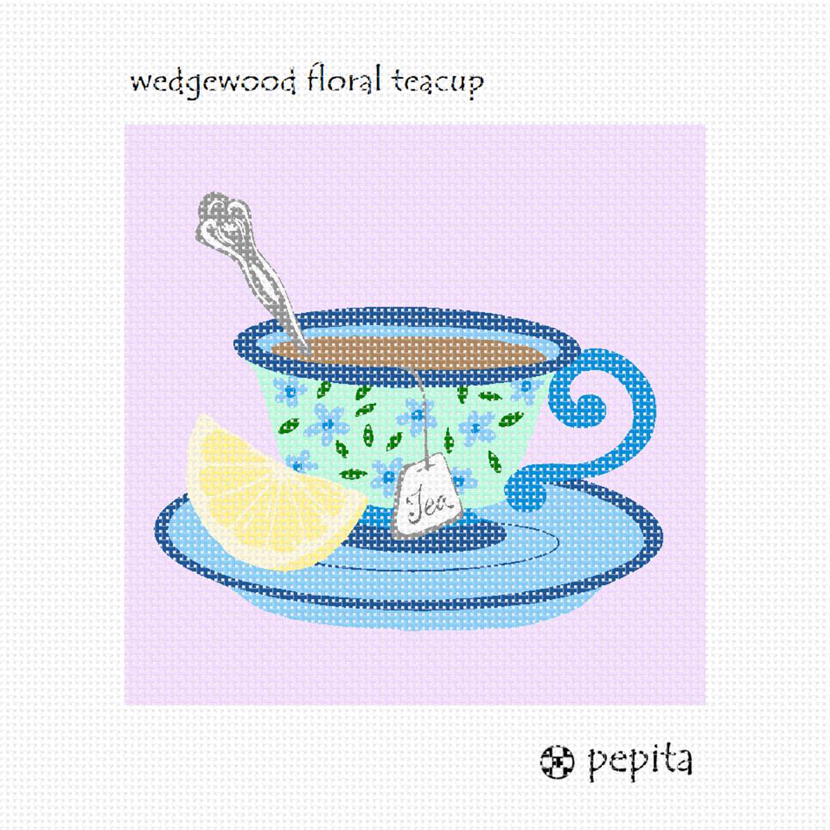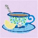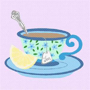 Whimsical teacup with spoon and lemon. All this canvas is missing is a sugar cube to suck on while the hot tea melts it on your tongue.
