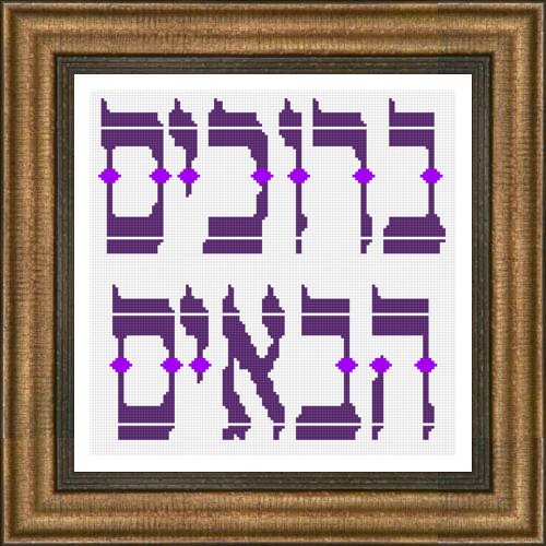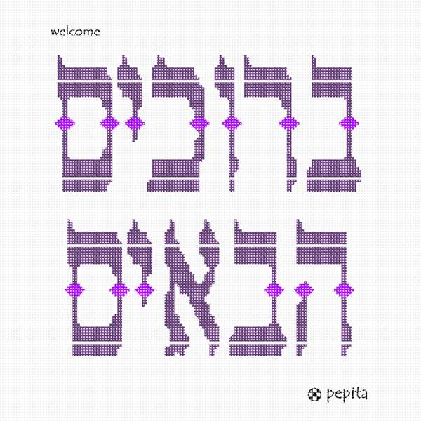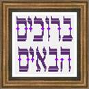 Stitch up a warm and welcoming wall-hanging for your front door or foyer. The Hebrew words "Berachim HaBaim", or "Blessed Be All Who Come", are rendered in fancy lettering, each letter embellished with a diamond design. Two colors will suffice for stitching this piece.