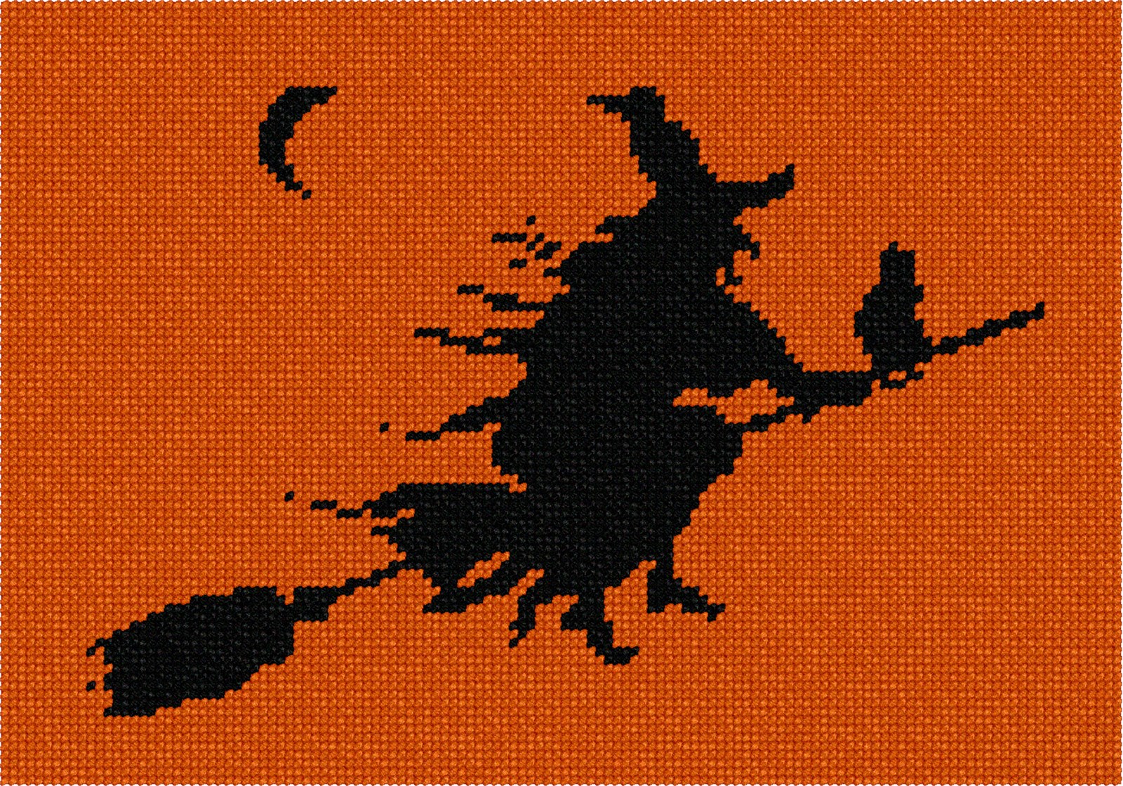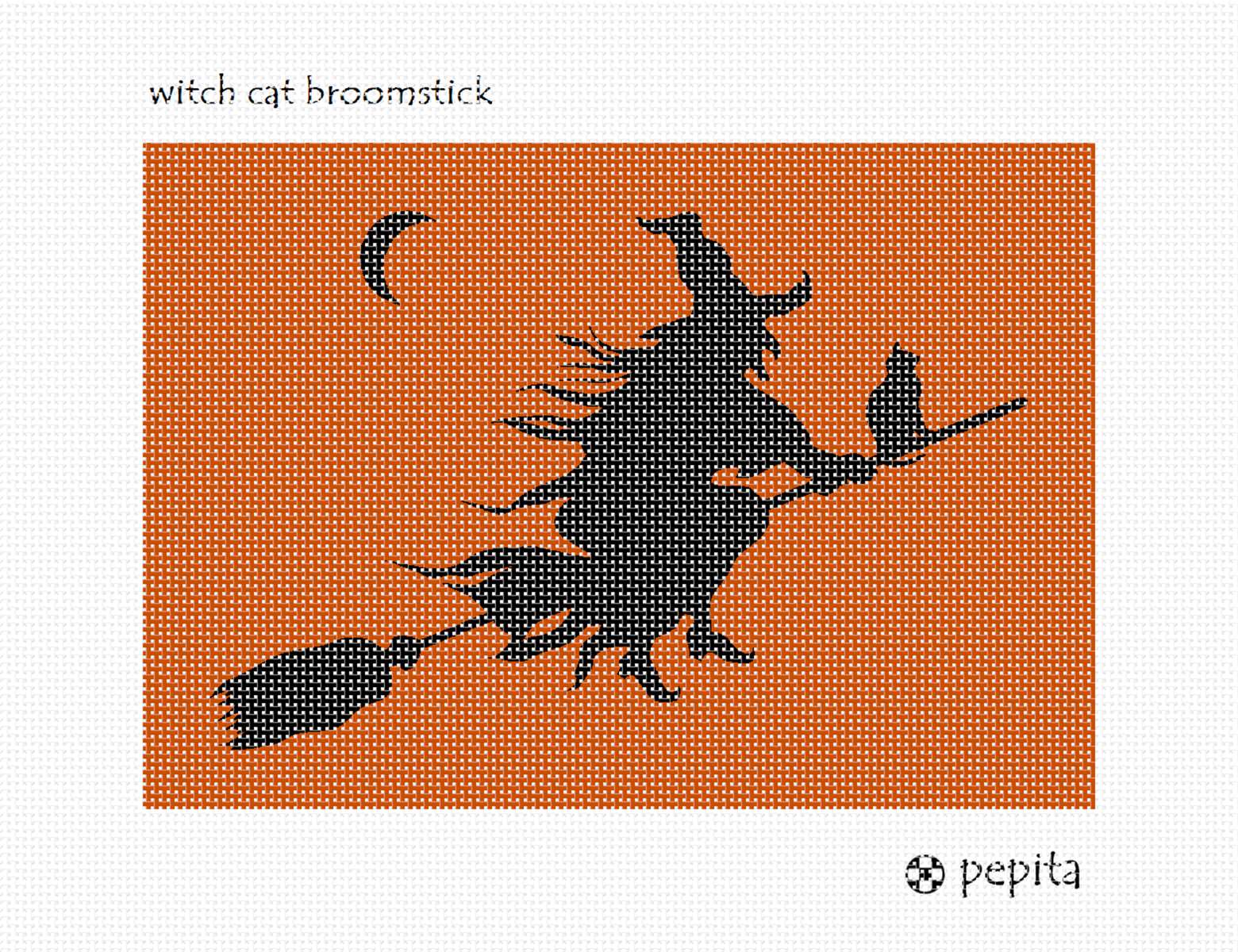 Needlepointers like stitching witches... and cats too! Here are both flying high in the sky on a broomstick.