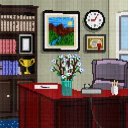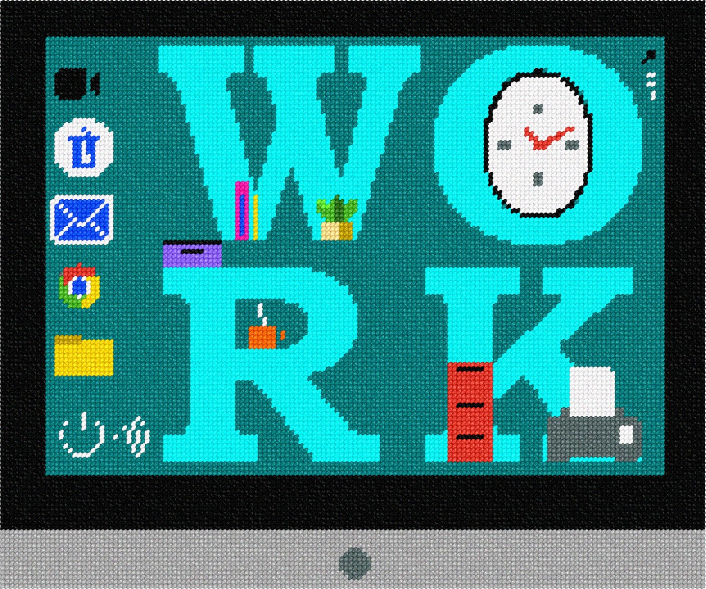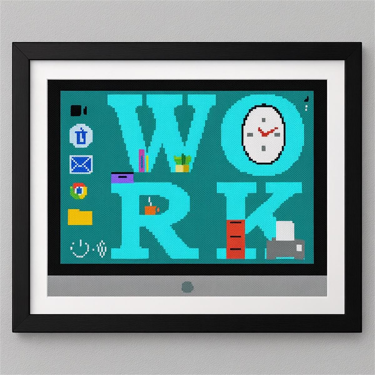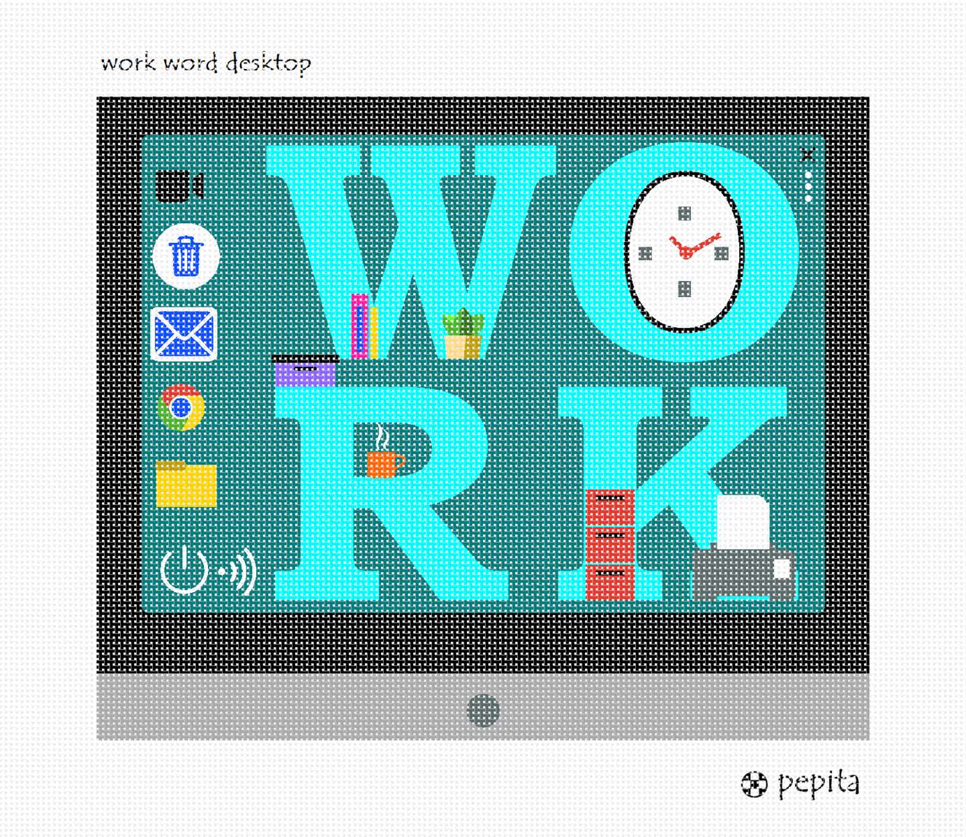 A desktop with the word "Work." The actual word is adorned with a clock, plant, steaming hot drink, containers, a printer, and books. The desktop has icons that include a video camera, trash can, file folder, power button, email, wireless, and more. Stitch for the computer savvy person in your life.