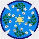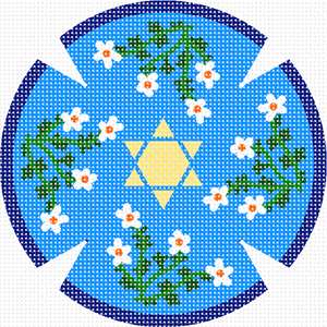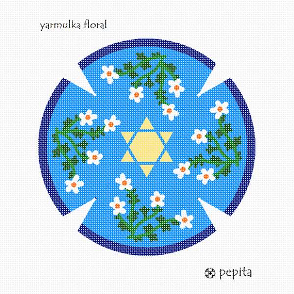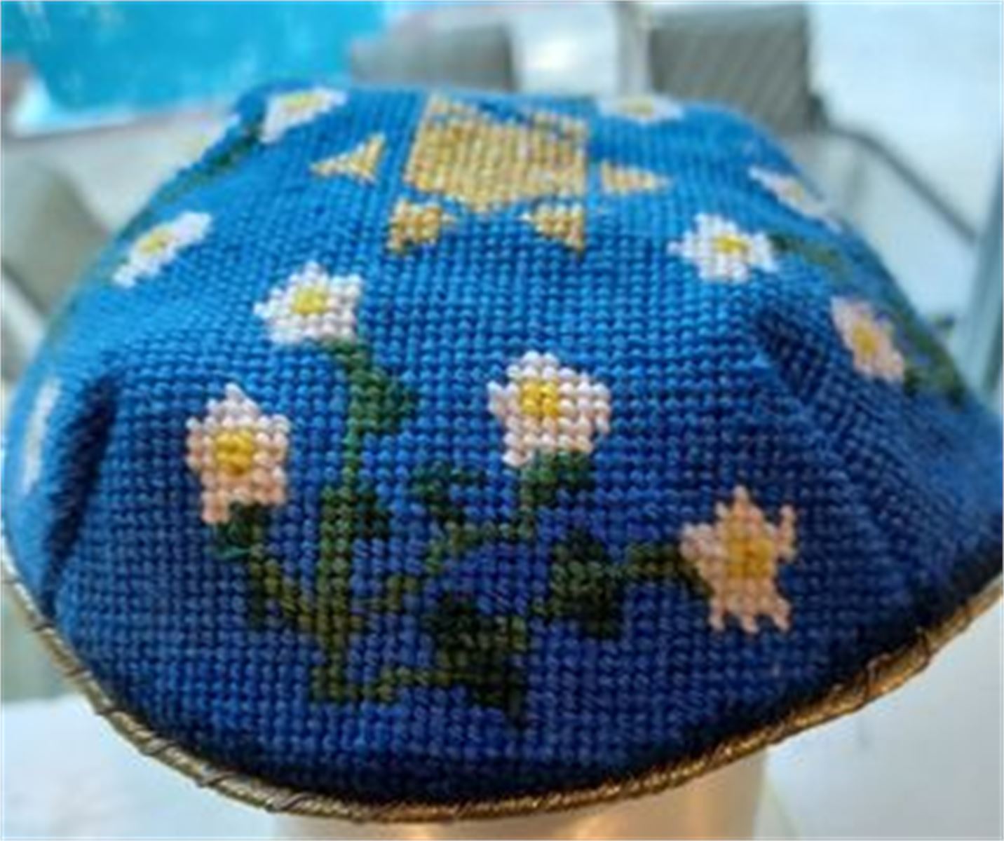 Flowers surround a Star of David in the center. A kippah is a brimless cap, usually made of cloth, traditionally worn by Jewish males to fulfill the customary requirement that the head be covered. It is worn by men in Orthodox communities at all times.