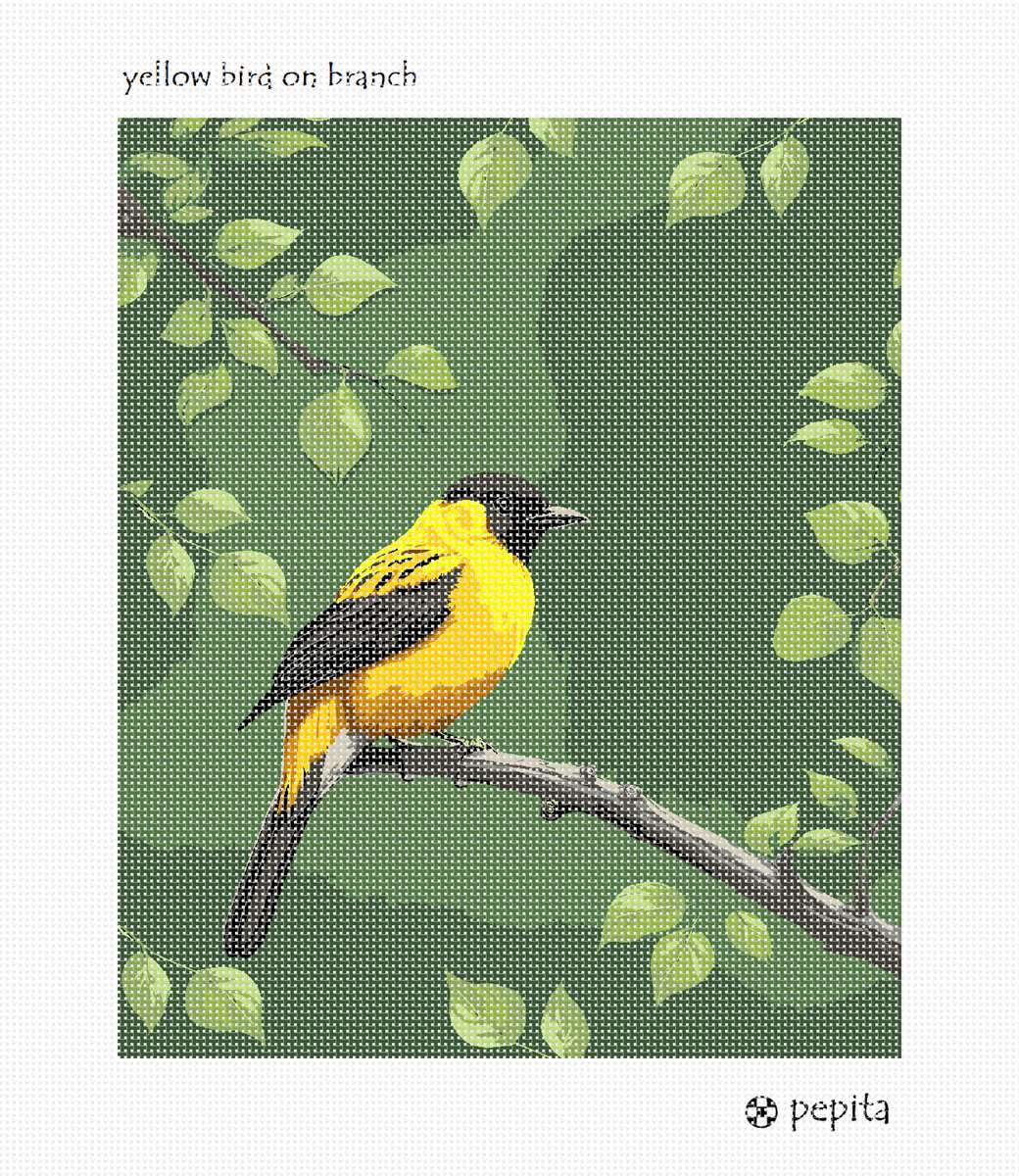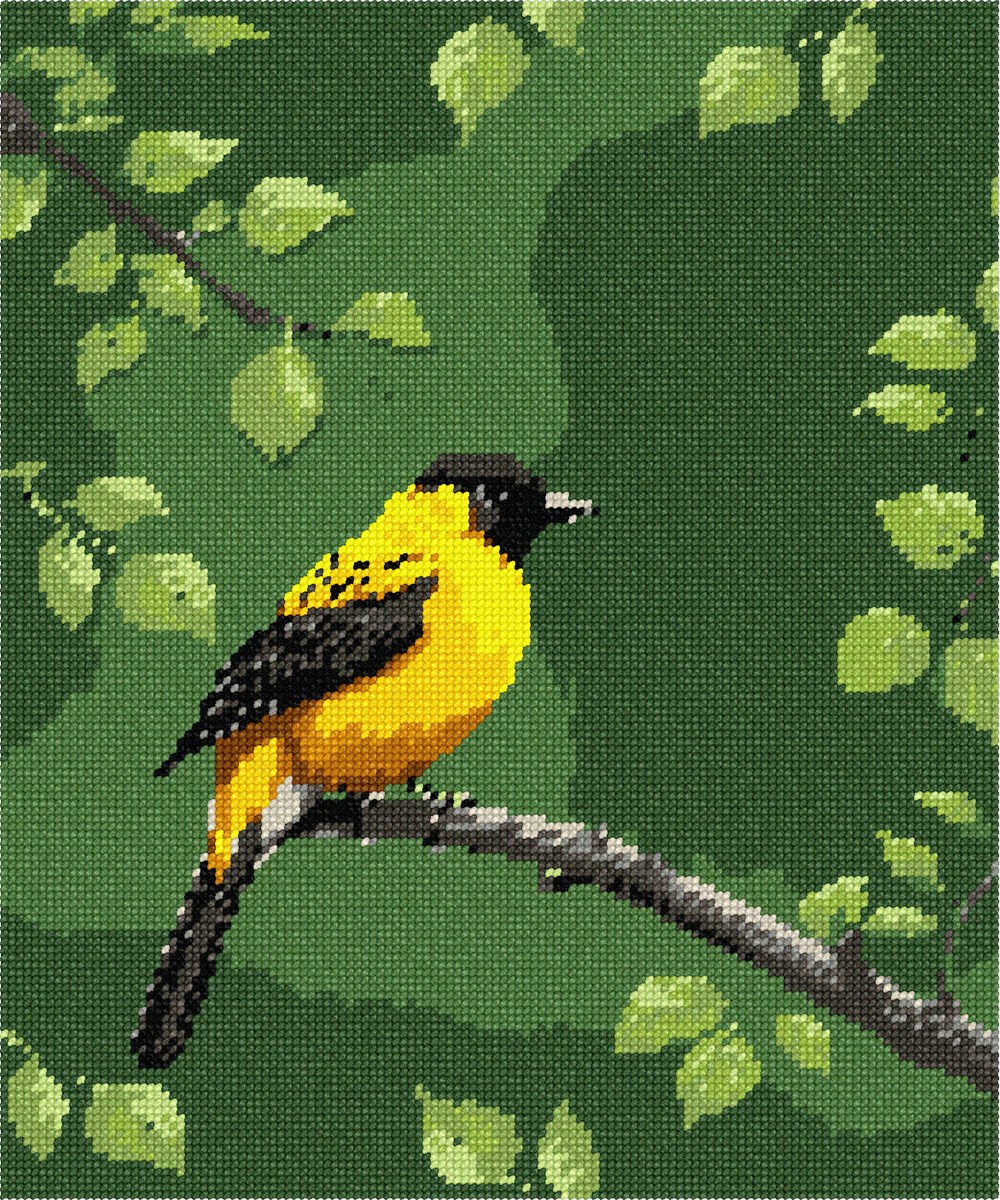 Birds are beloved! In the needlepoint world, birds are a popular genre to stitch. This yellow bird is comfortably resting on a branch of a tree with many leaves about.