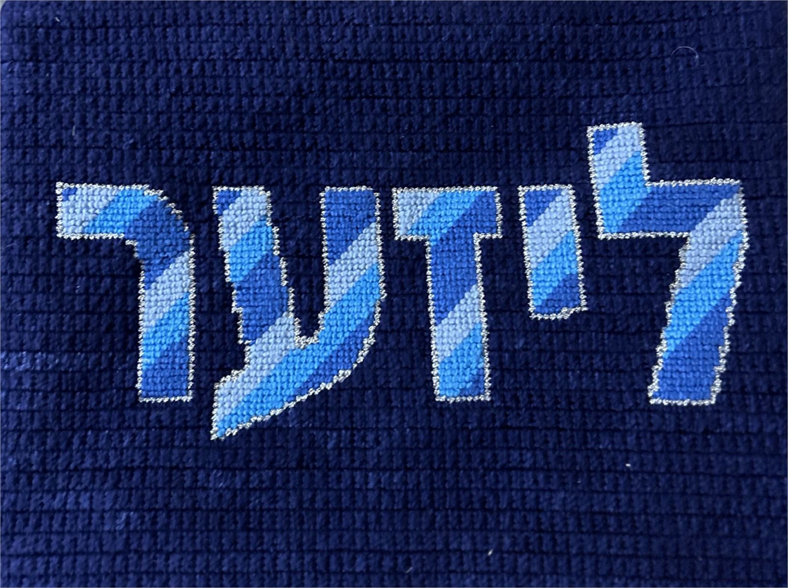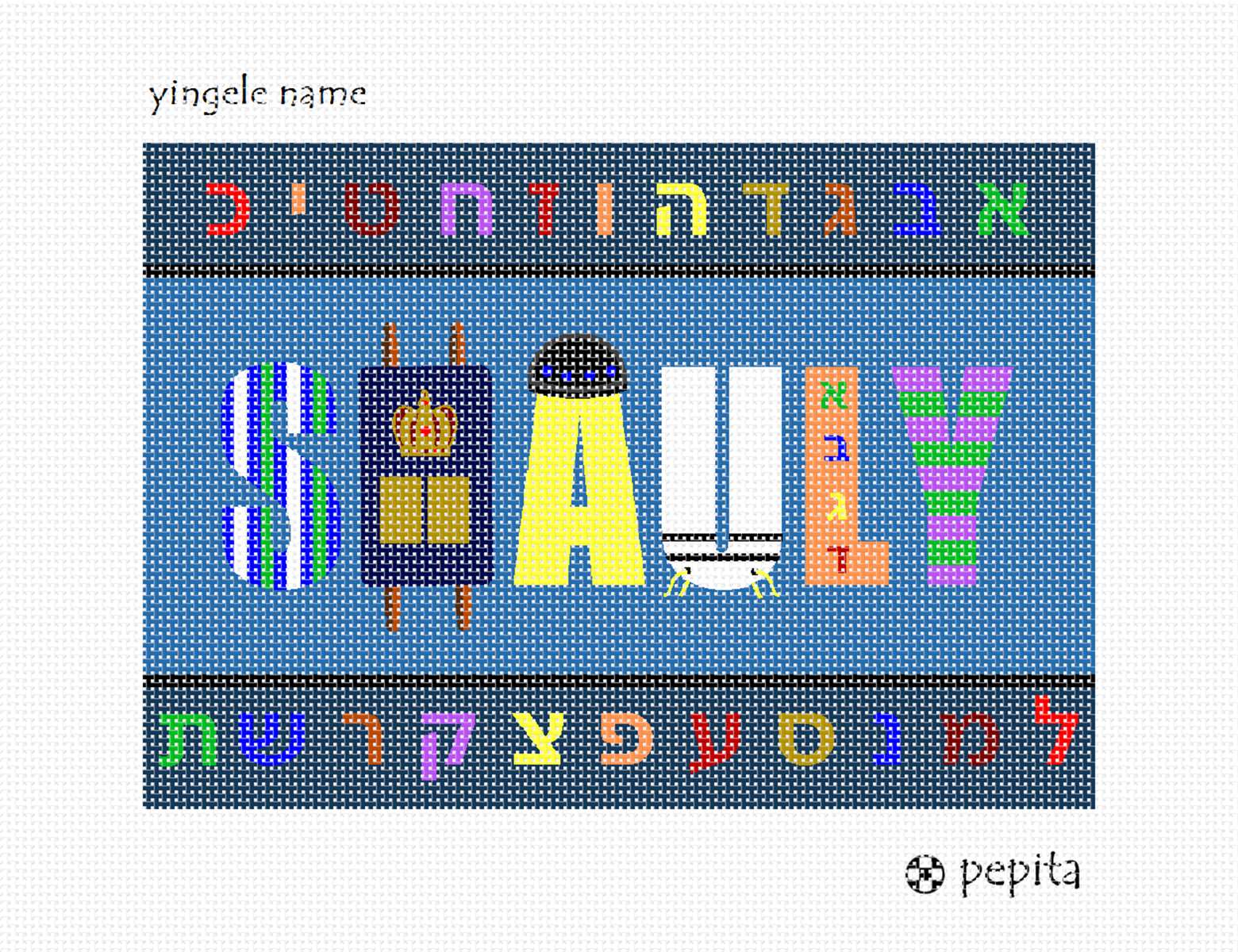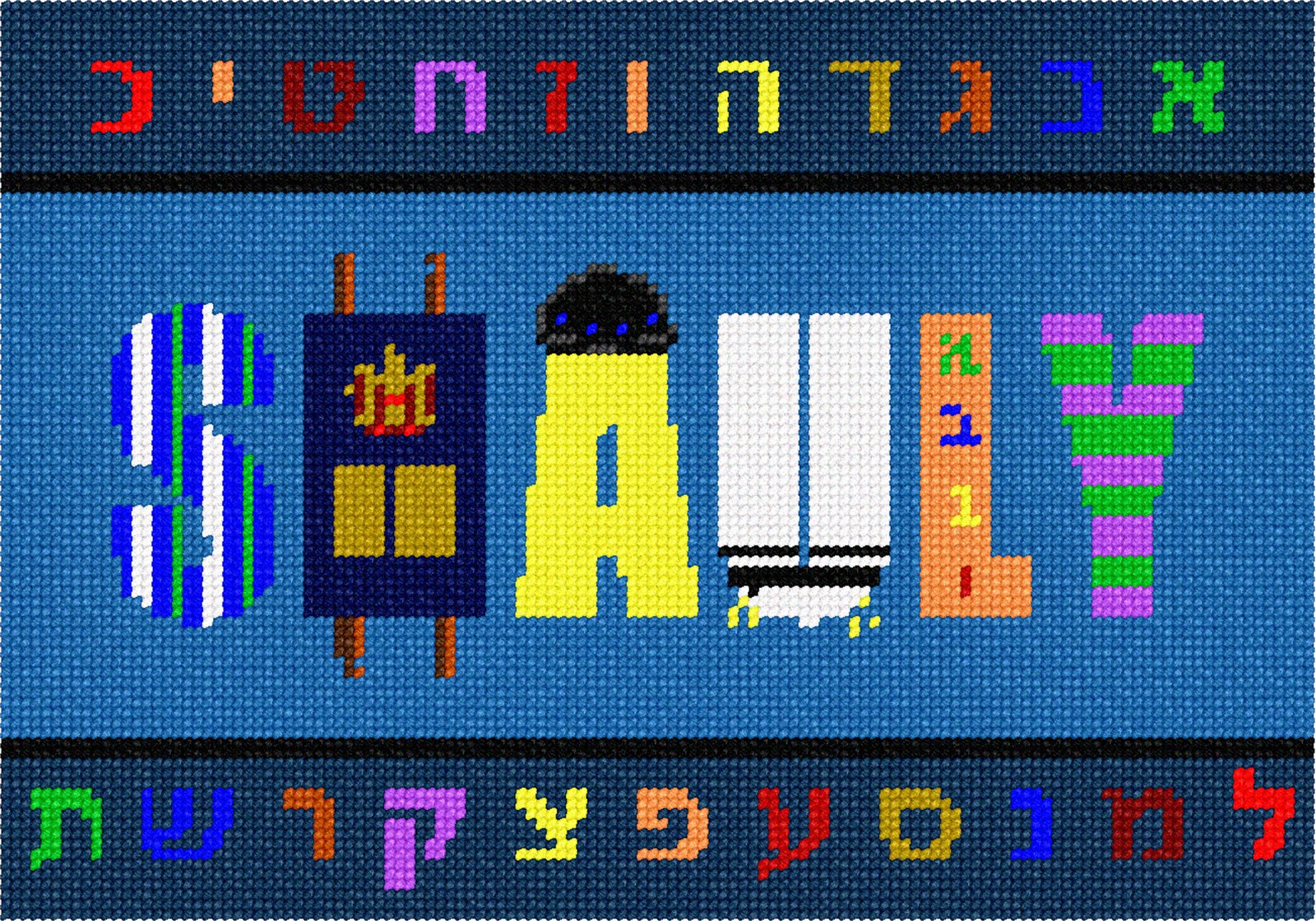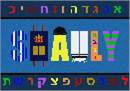 Perfect for an upsherin boy - with tzitzis, yarmulka, and more. The Aleph Bais letters run across the top and bottom.